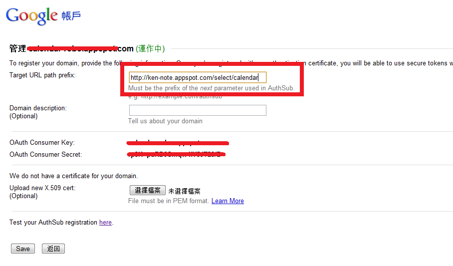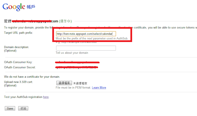 這邊我們加入了一個Domain為: ken-note.appspot.com