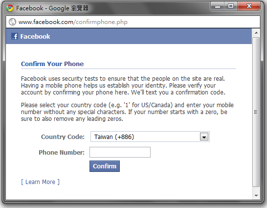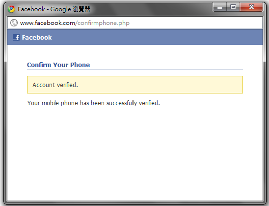 點下圖三中的Confirm按鈕以後,Facebook會回傳一組verify code至您的手機,